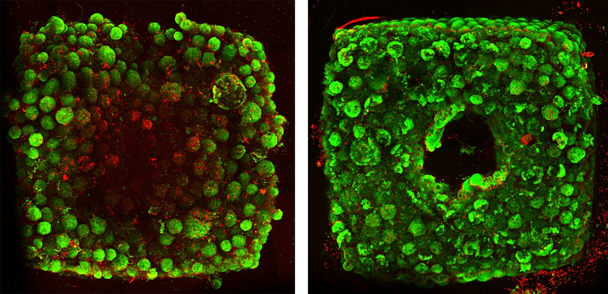 “Forming a dense matrix from these OBBs kills two birds with one stone: not only does it achieve a high cellular density akin to that of human organs, but the matrix’s viscosity also enables printing of a pervasive network of perfusable channels within it to mimic the blood vessels that support human organs,” added co-first author Sébastien Uzel, Ph.D., a Research Associate at the Wyss Institute and SEAS.